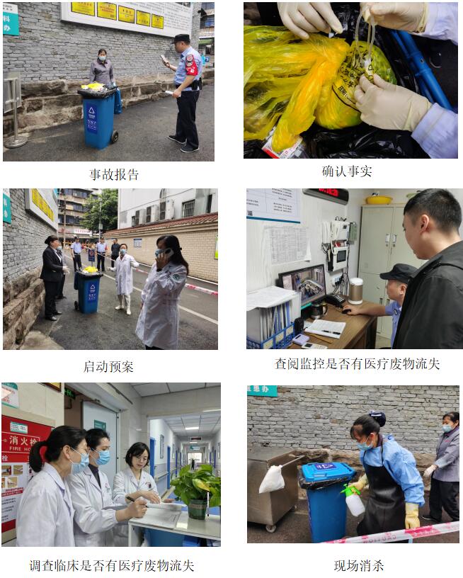 此次演练以保卫科在日常巡查中发现一名保洁工存在可疑私自转运医疗废物为背景,在分管副院长曹咏梅的指挥下,按照事故报告、启动应急预案、现场处置、演练总结四大步骤依次进行。在多部门的共同配合下,此次医疗废物意外事故应急预案演练得以顺利完成。