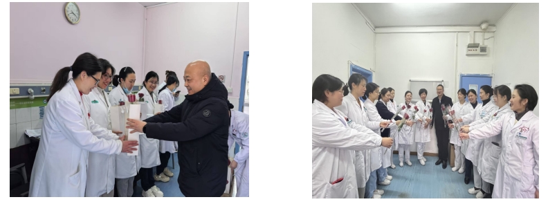 3月7日8点至8点30分院领导班子分别走访临床一线,为女职工送上鲜花与节日礼包,并通过医院办公网、医院管理微信群向全体女职工表达节日祝福。