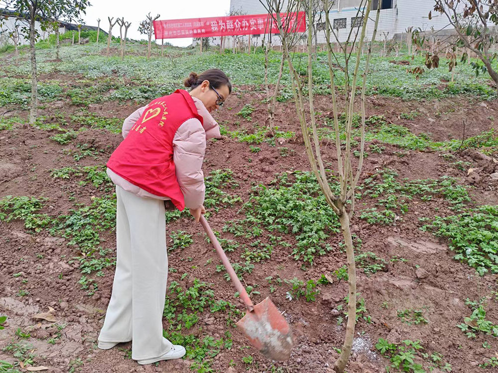 植树现场,充分利用“四旁”“五边”等闲置空地造林添绿,大家纷纷拿起铁锹忙活起来,参加人员相互配合作业,将一棵棵树苗放入树坑内,挥锄挖土,扶苗填坑,踩实松土,提水灌溉,齐心协力用自己的辛勤汗水为巴南大地绿起栽下一棵棵紫荆、樱花。巾帼志愿者与春光美景交相辉映,挥洒着巾帼风采,一株株新栽种的树苗迎风挺立,为绿美花溪增添了一抹抹生机勃勃的春意。