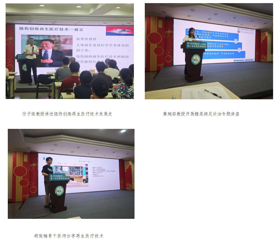 付子俊教授系统地讲解了再生医疗技术的发展及多学科应用,分享了湿润疗法在皮肤创面复原再生临床应用,理论结合临床实践分享多个病例,涵盖烧伤、切口感染、各种慢性溃疡创面等多个病种,详细讲解患者综合治疗方案;龚琬茹教授则重点讲解再生医疗技术在糖尿病足诊治中的应用,从糖尿病足病变的病因及综合治疗和再生医疗技术在其中的应用进行了详细讲解;区二院创面修复科骨干医生胡俊楠2024年至郫都区人民医院完成进修,本次会议也带来我院在再生医疗技术在难治性创面治疗效果的分享,希望携手巴南区各兄弟单位共同为难愈性创面患者提供最佳治疗方案。