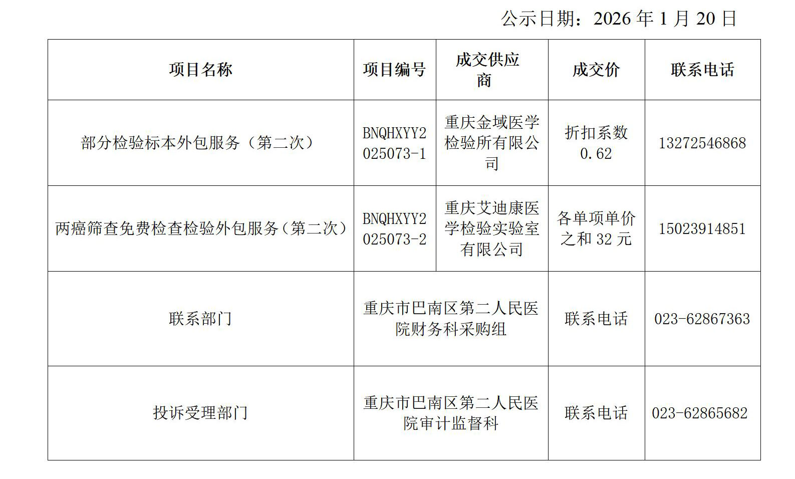 部分检验标本外包服务、两癌筛查免费检查检验外包服务采购结果公告(第二次)